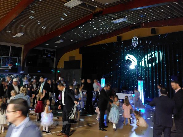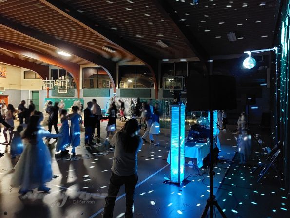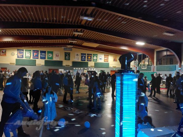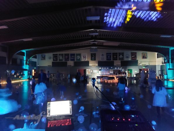 My background in education has been very conducive to working with all ages, especially events with children. The families did an amazing job setting up for this Snow Glow Daddy Daughter Dance, allowing me to light the gym and fill it with dancing. Two games that went over well the freeze version of ‘Have you ever?’ – after everyone is frozen, you jump up and dance if you meet the qualification; and Go Skating – daughters ‘skate’ dance away from dads until I call everyone home, where they warm themselves by touching the named body parts together, like hands! hips! eyelashes! Yes, I make up these games, mostly based on other games but altered for the audience and theme. All this and the mirror ball looked great during our 3 slow dances.