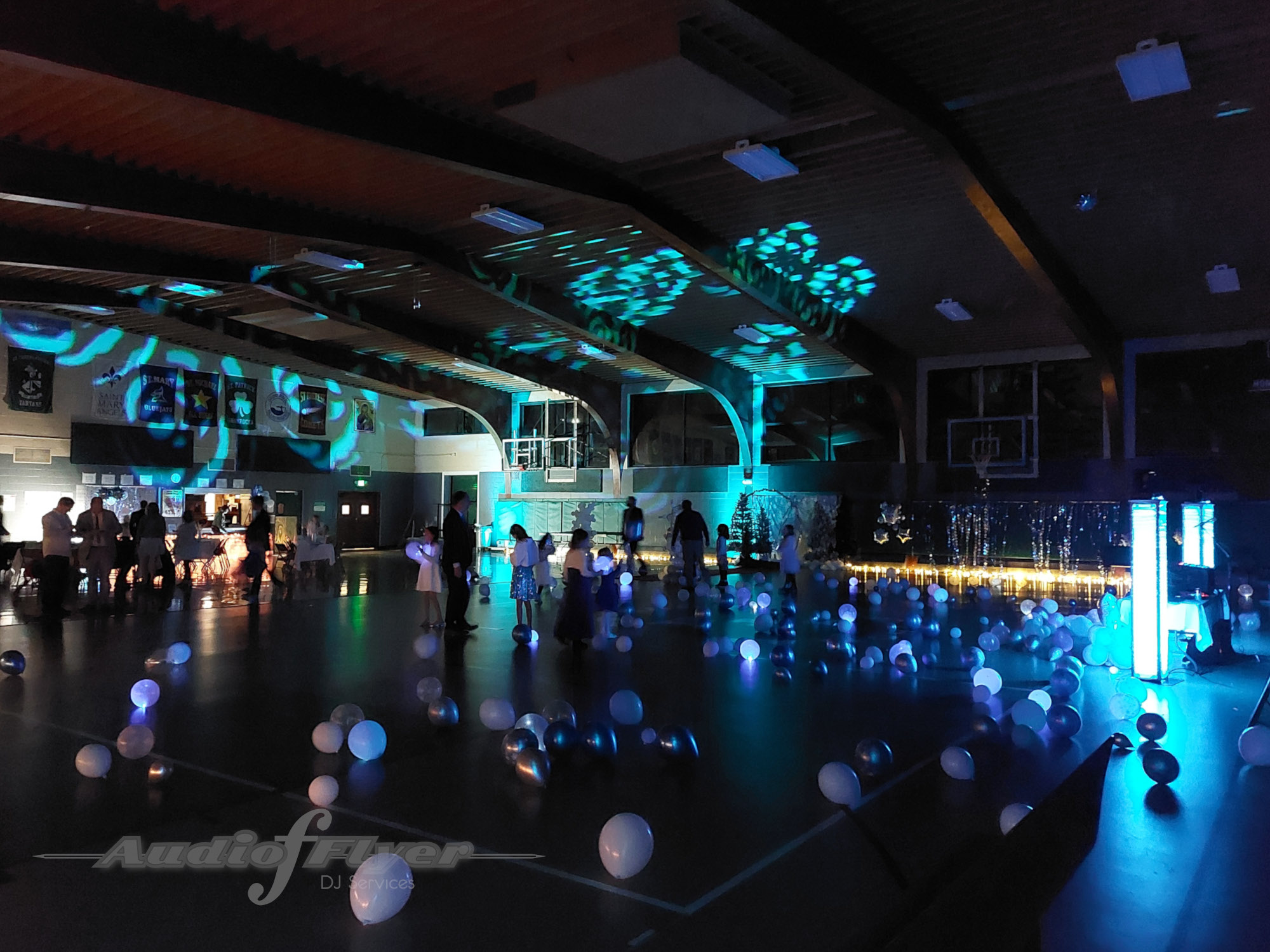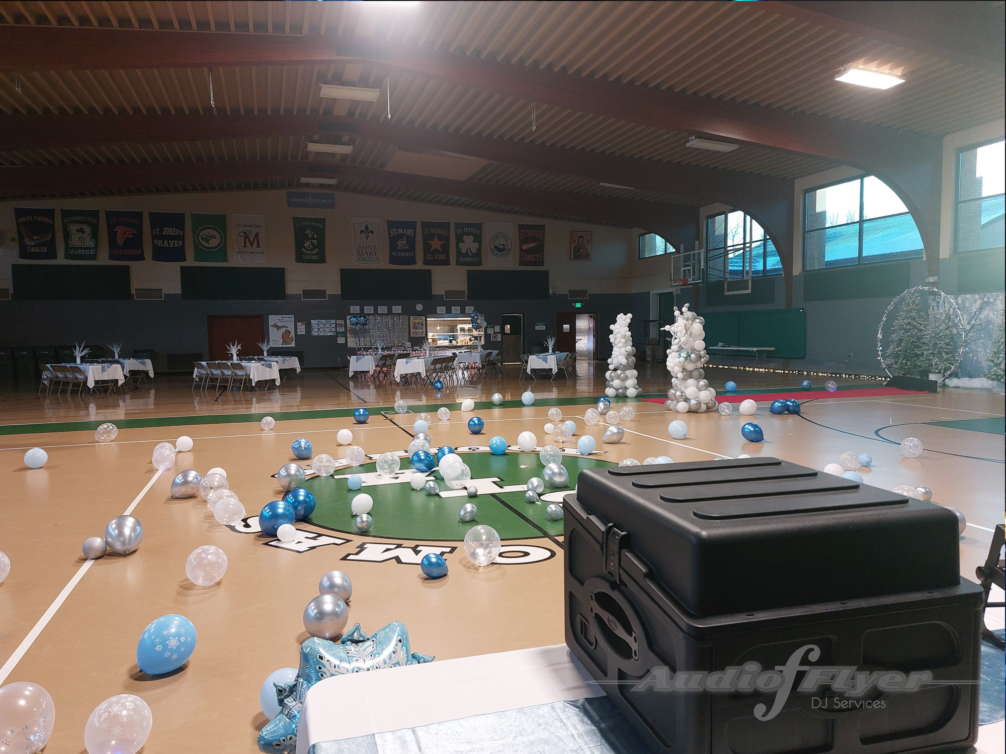 My background in education has been very conducive to working with all ages, especially events with children. The families did an amazing job setting up for this Snow Glow Daddy Daughter Dance, allowing me to light the gym and fill it with dancing. Two games that went over well the freeze version of ‘Have you ever?’ – after everyone is frozen, you jump up and dance if you meet the qualification; and Go Skating – daughters ‘skate’ dance away from dads until I call everyone home, where they warm themselves by touching the named body parts together, like hands! hips! eyelashes! Yes, I make up these games, mostly based on other games but altered for the audience and theme. All this and the mirror ball looked great during our 3 slow dances.